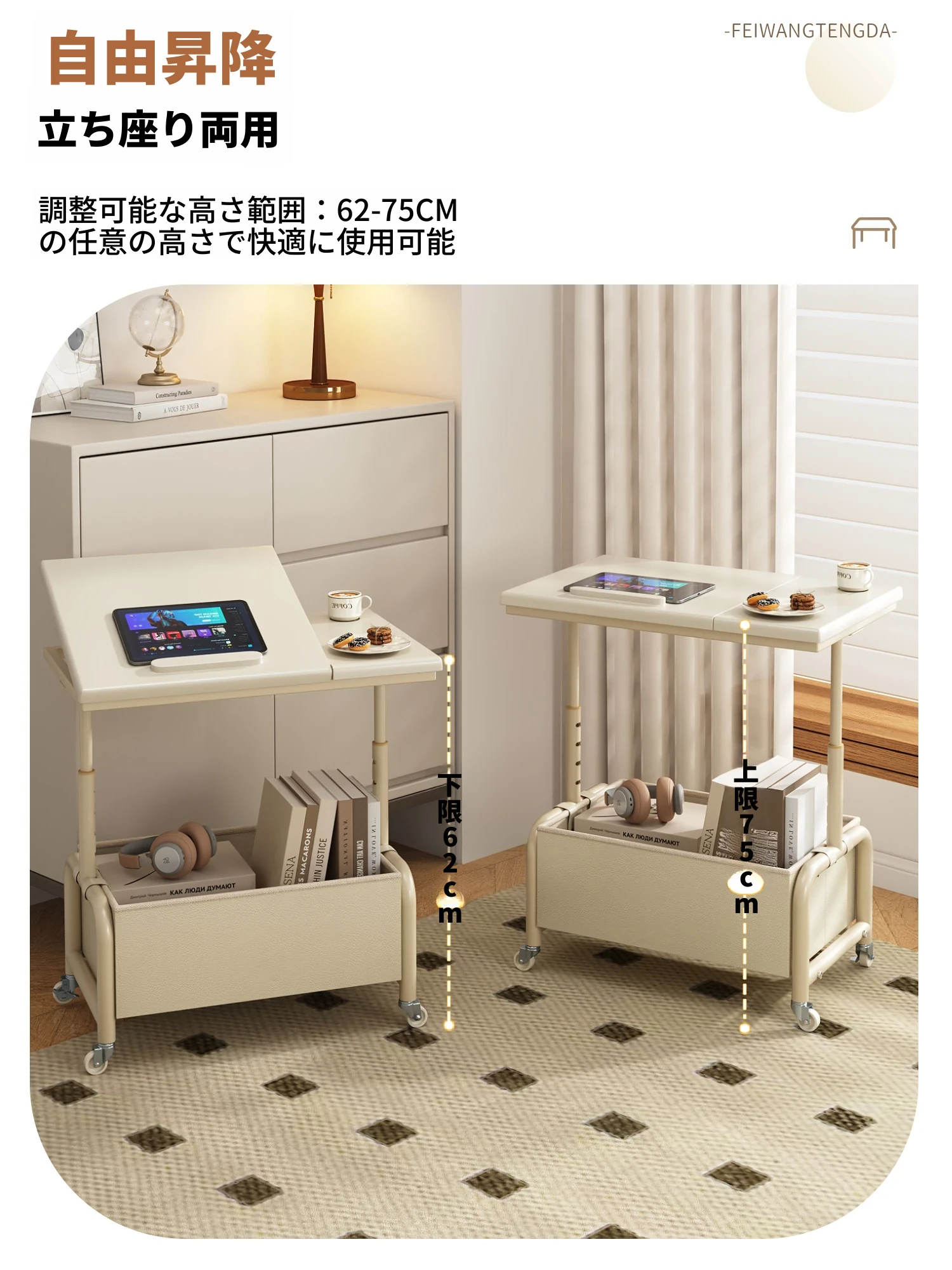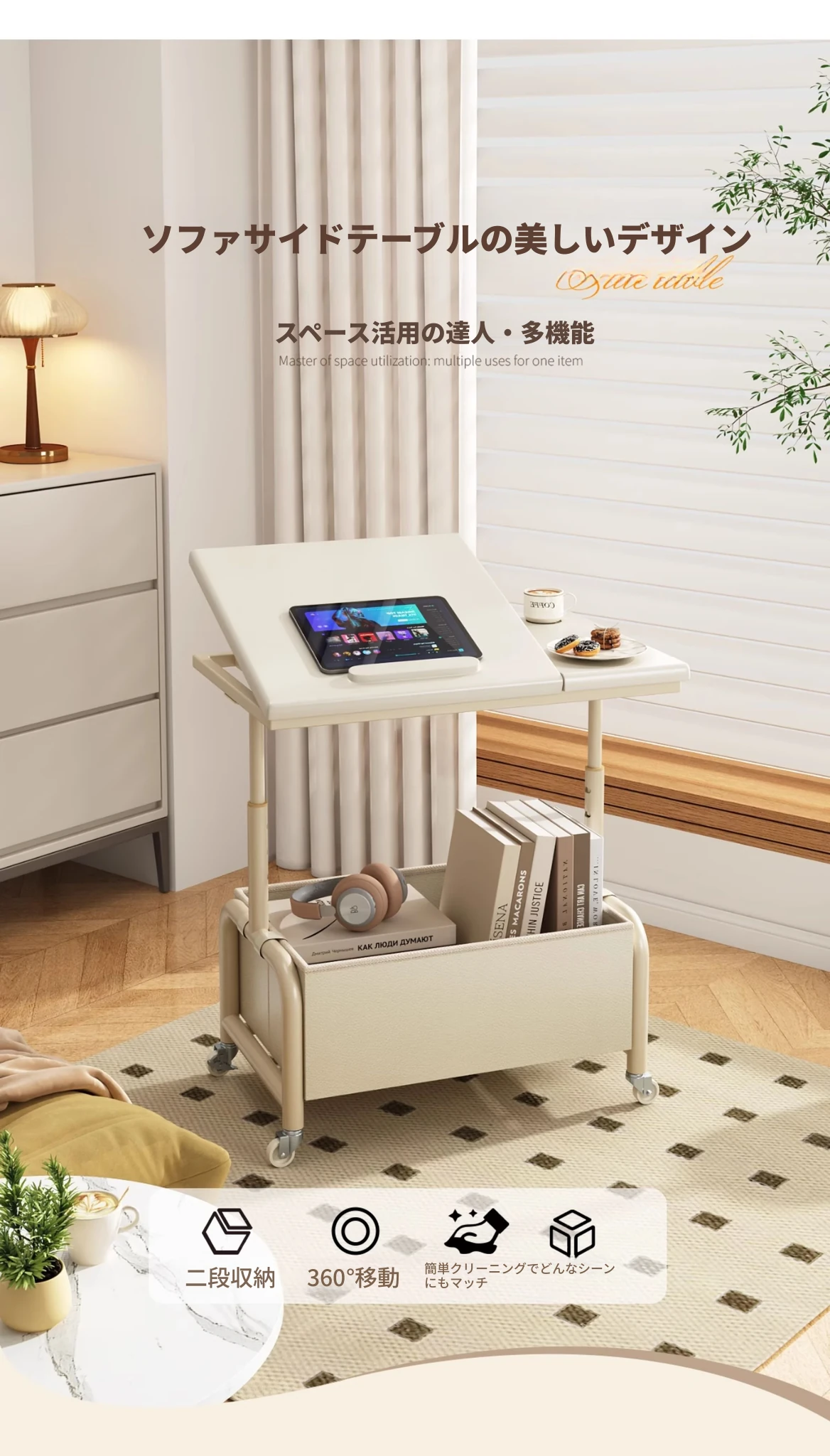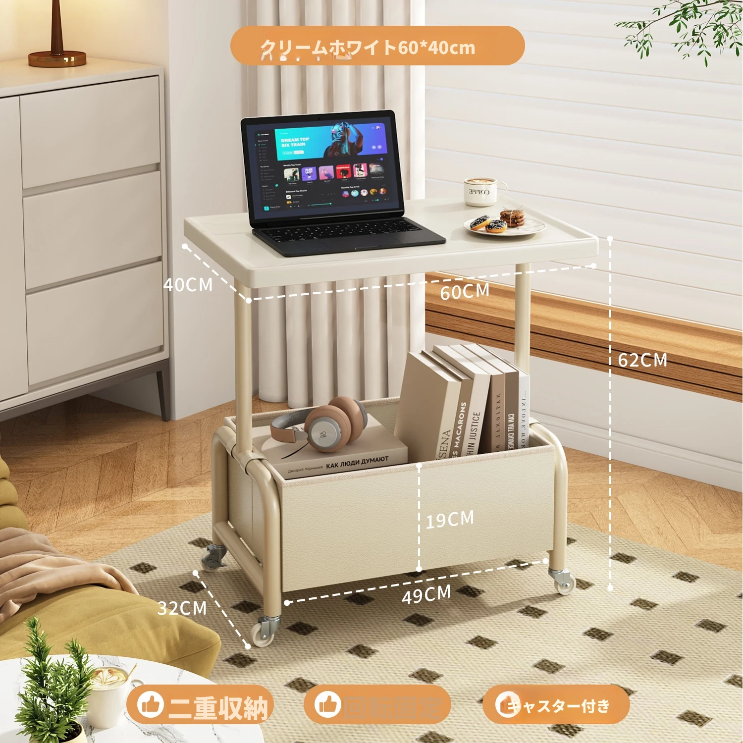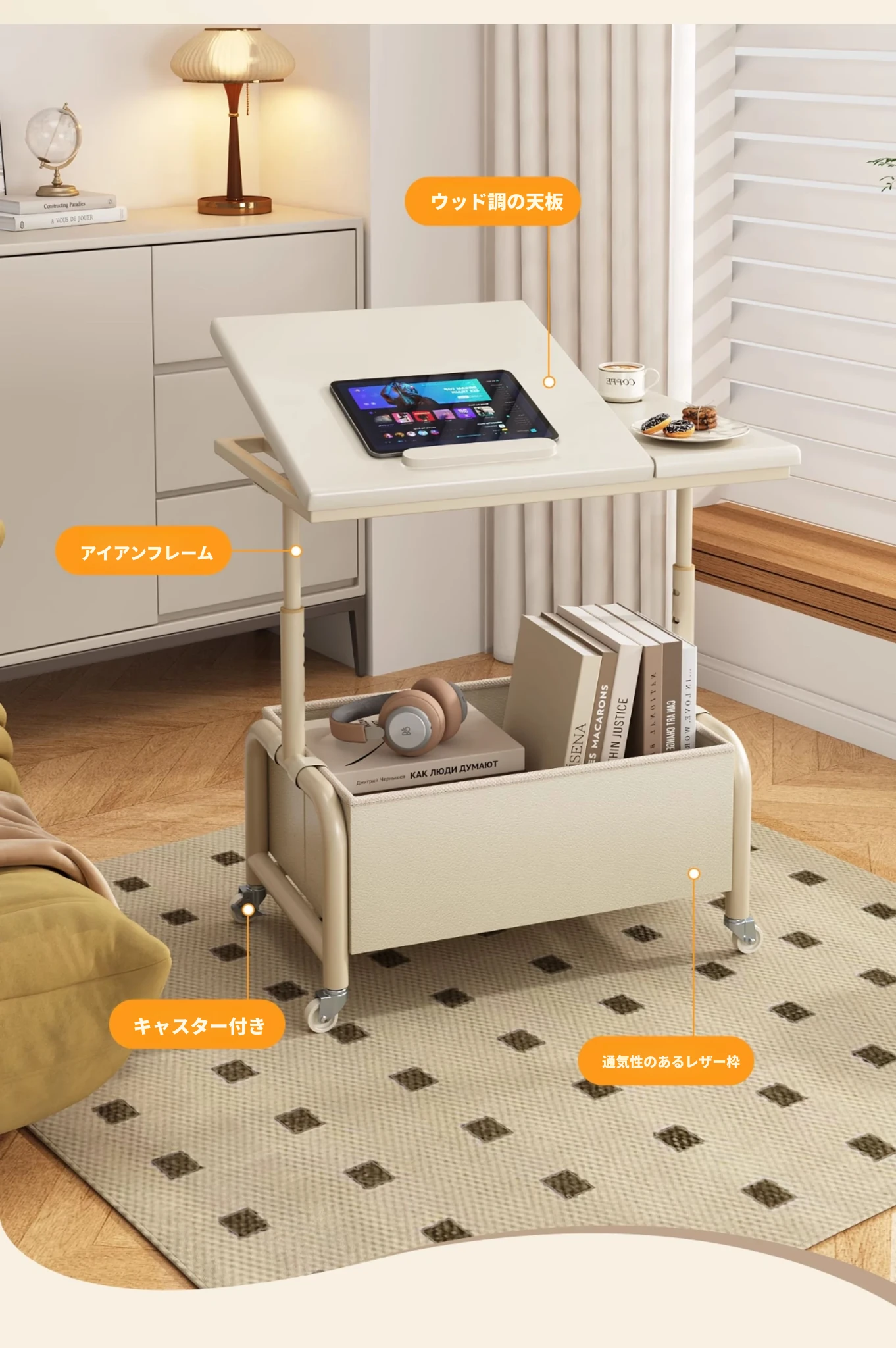 移動式昇降テーブル!おしゃれなクリーム風デザインの小型キャスター付きカート。バルコニーやベッドサイドに最適な収納ラックとしても使える、リビングのソファ横にぴったりのサイドテーブルです!