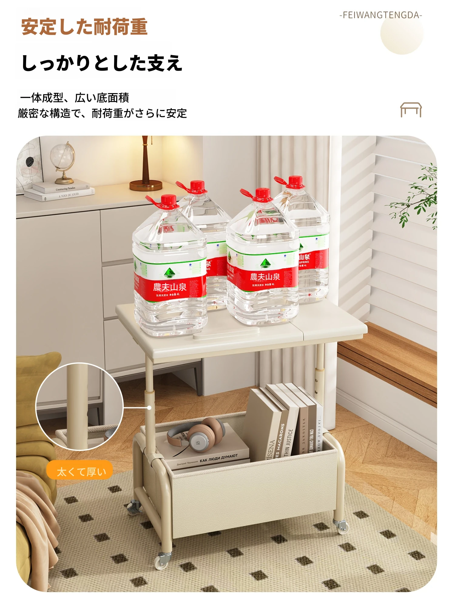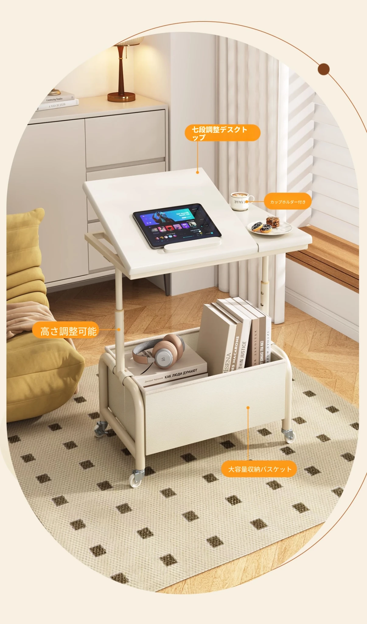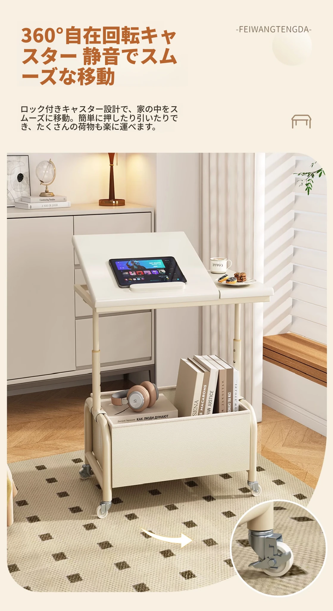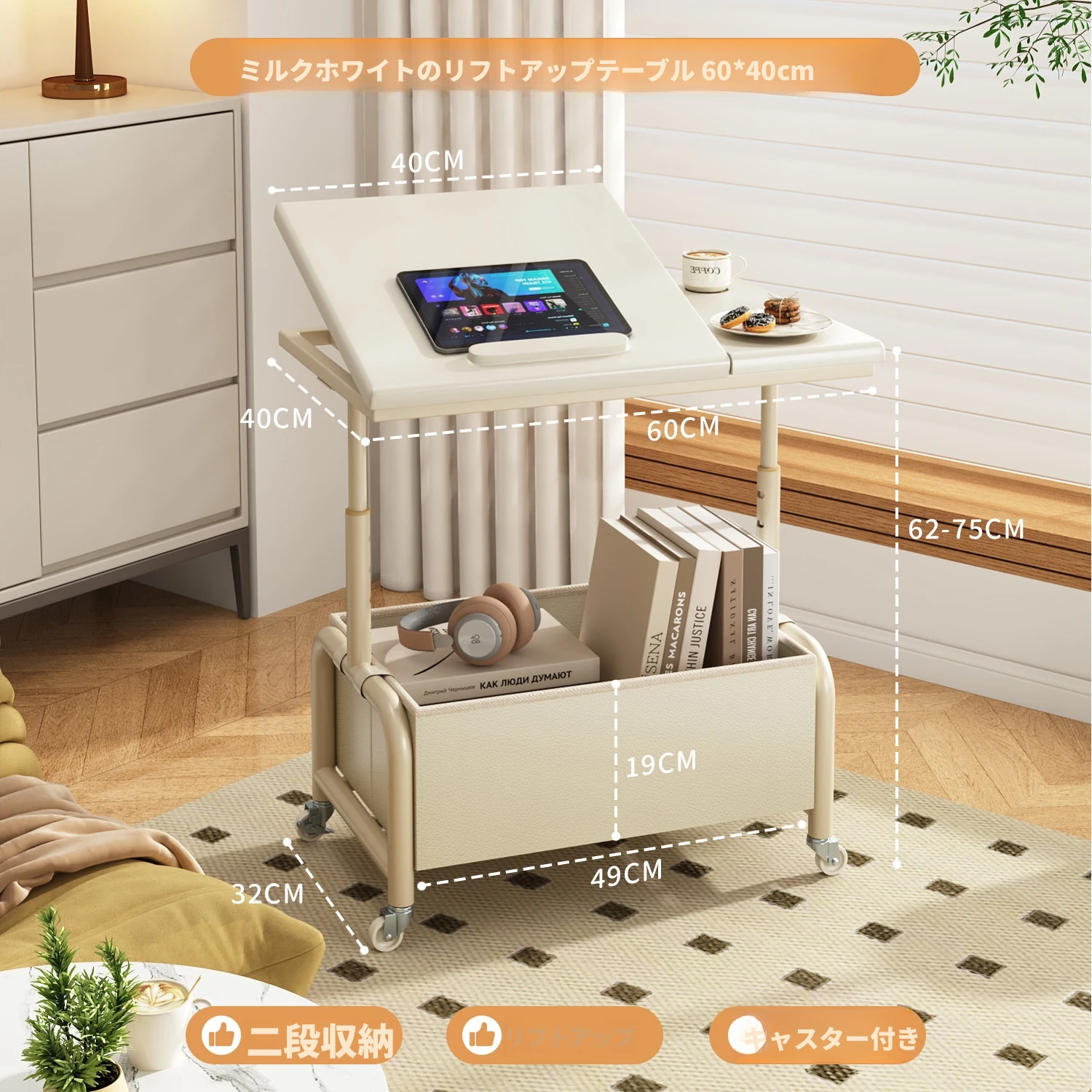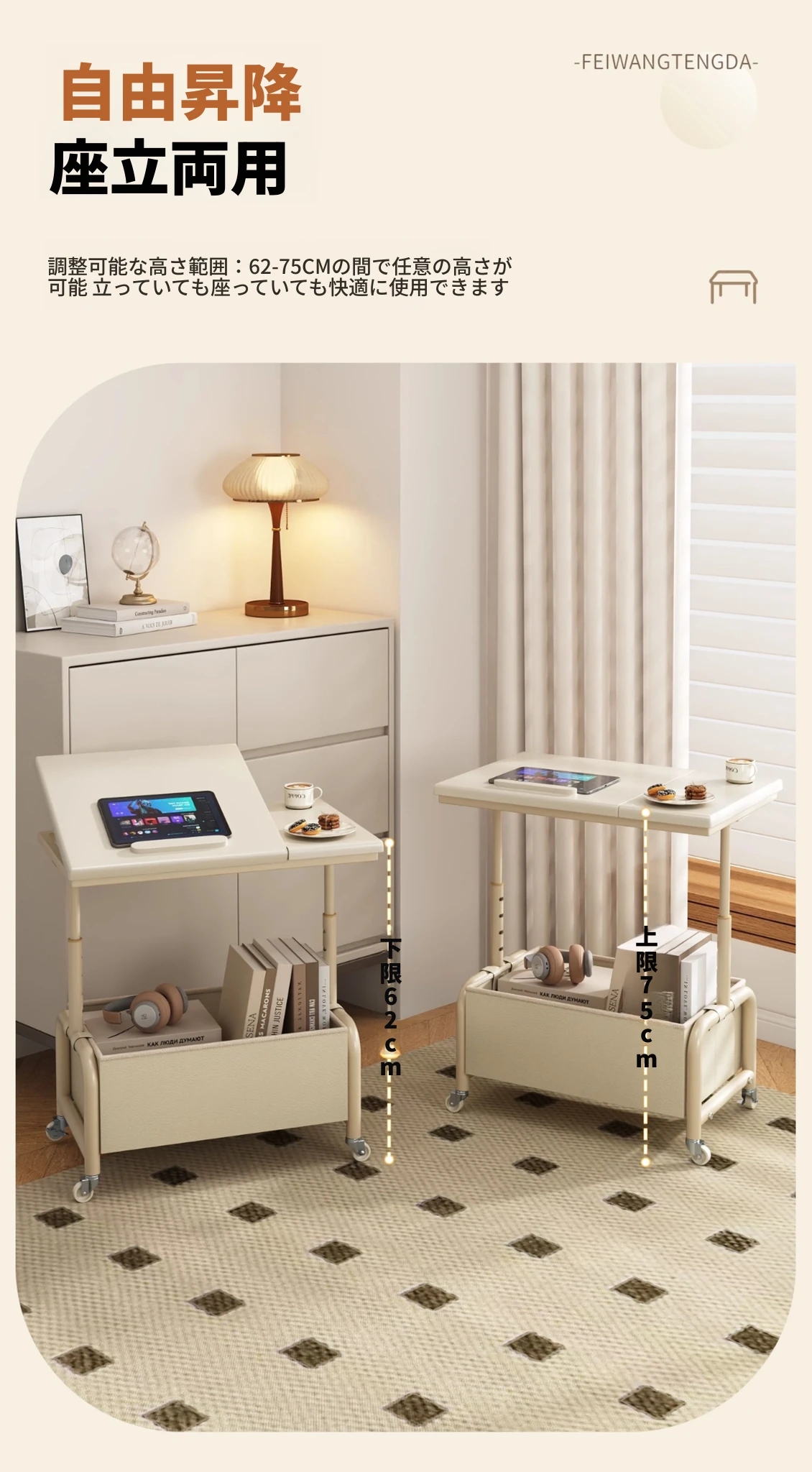 移動式昇降テーブル!おしゃれなクリーム風デザインの小型キャスター付きカート。バルコニーやベッドサイドに最適な収納ラックとしても使える、リビングのソファ横にぴったりのサイドテーブルです!