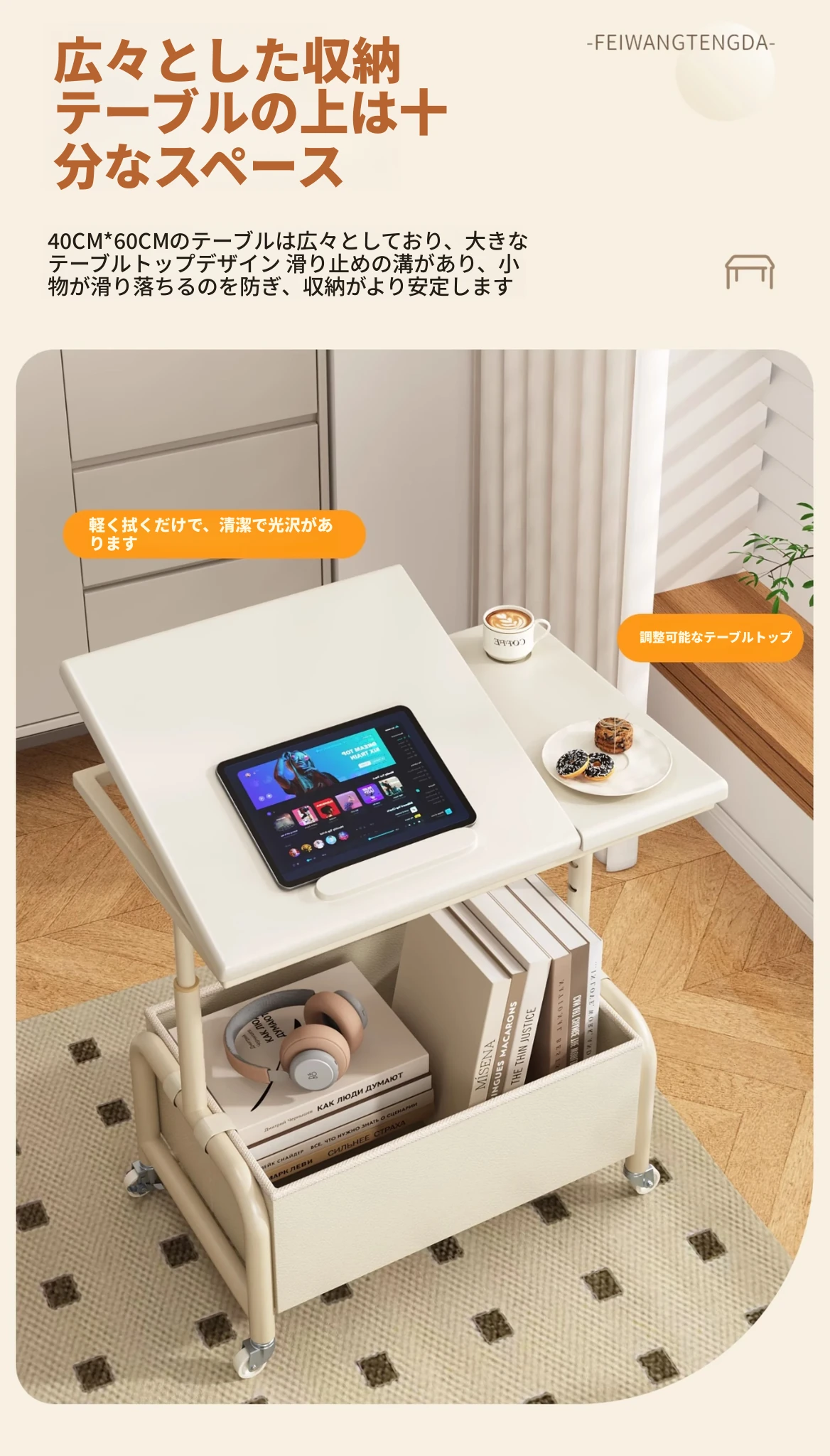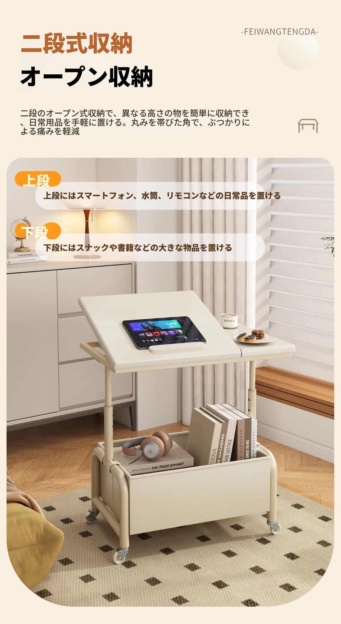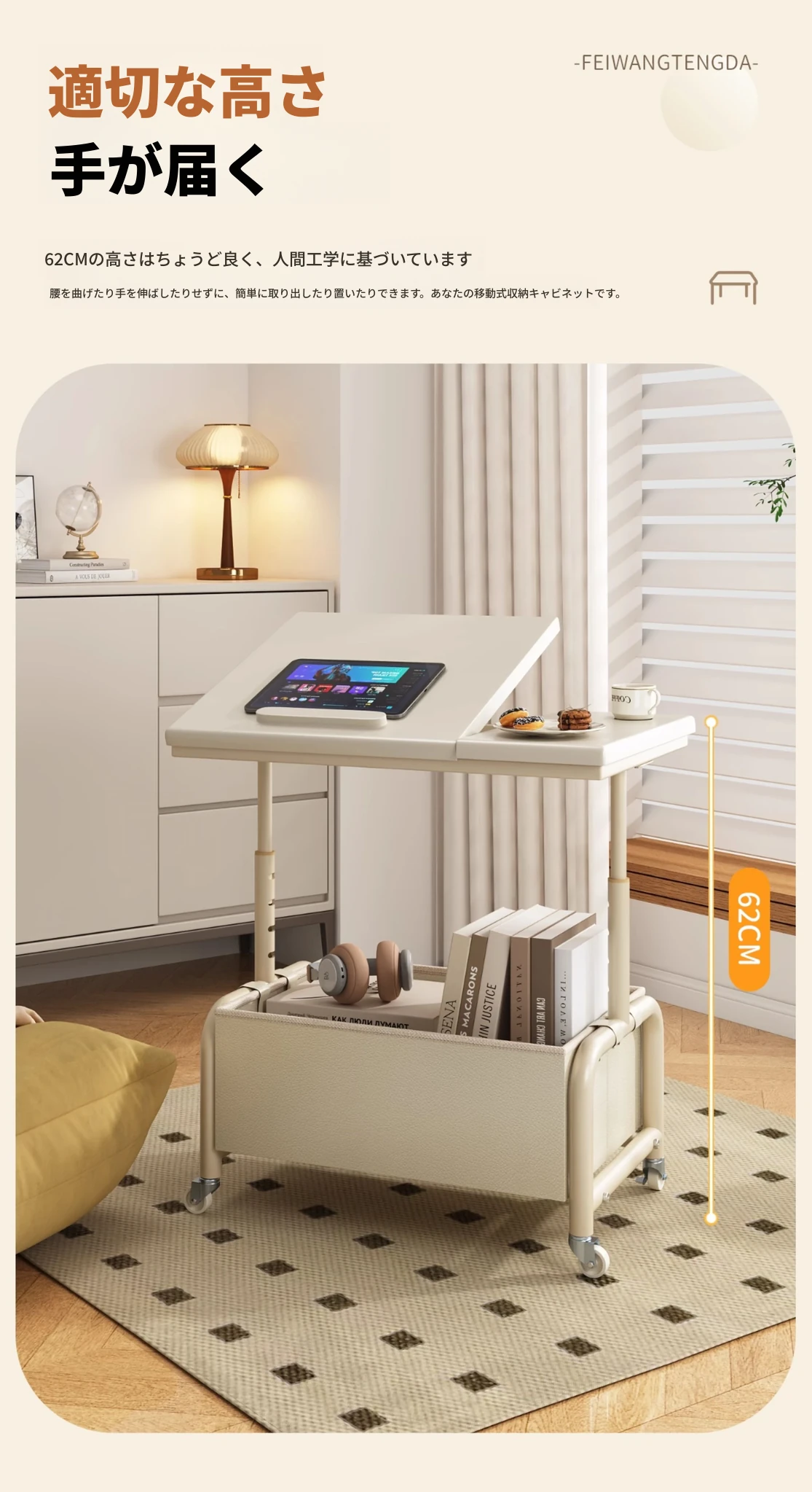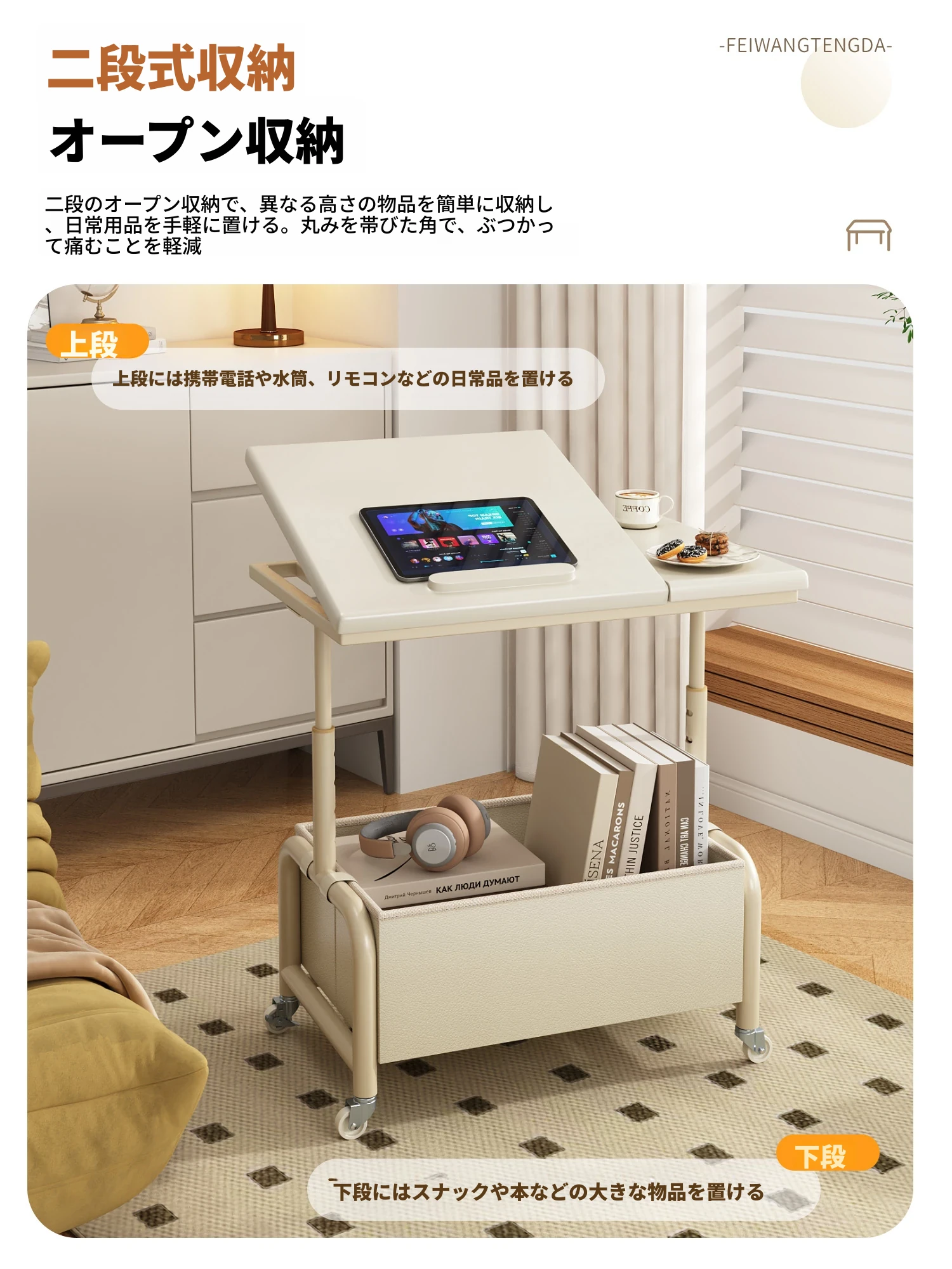 移動式昇降テーブル!おしゃれなクリーム風デザインの小型キャスター付きカート。バルコニーやベッドサイドに最適な収納ラックとしても使える、リビングのソファ横にぴったりのサイドテーブルです!