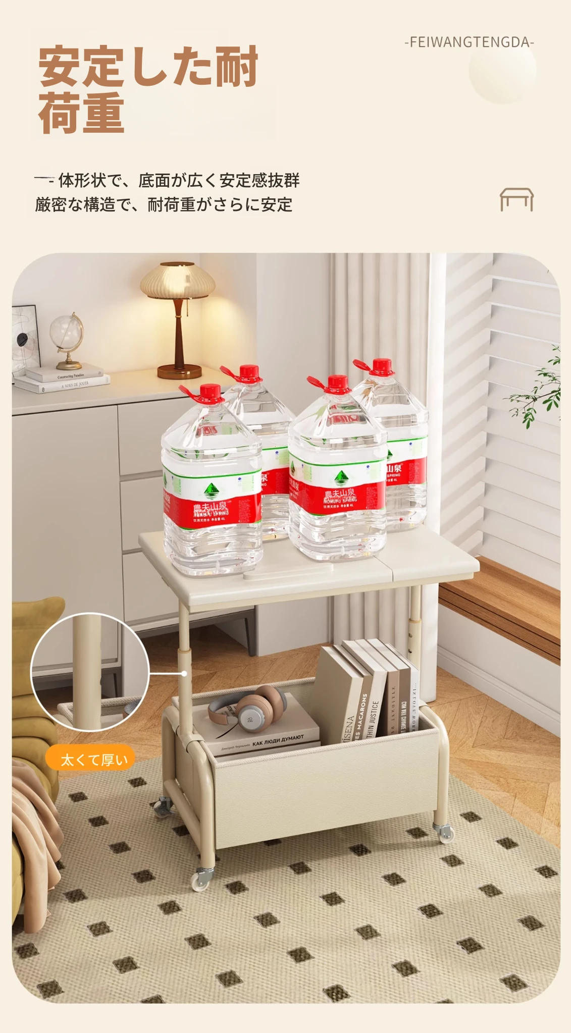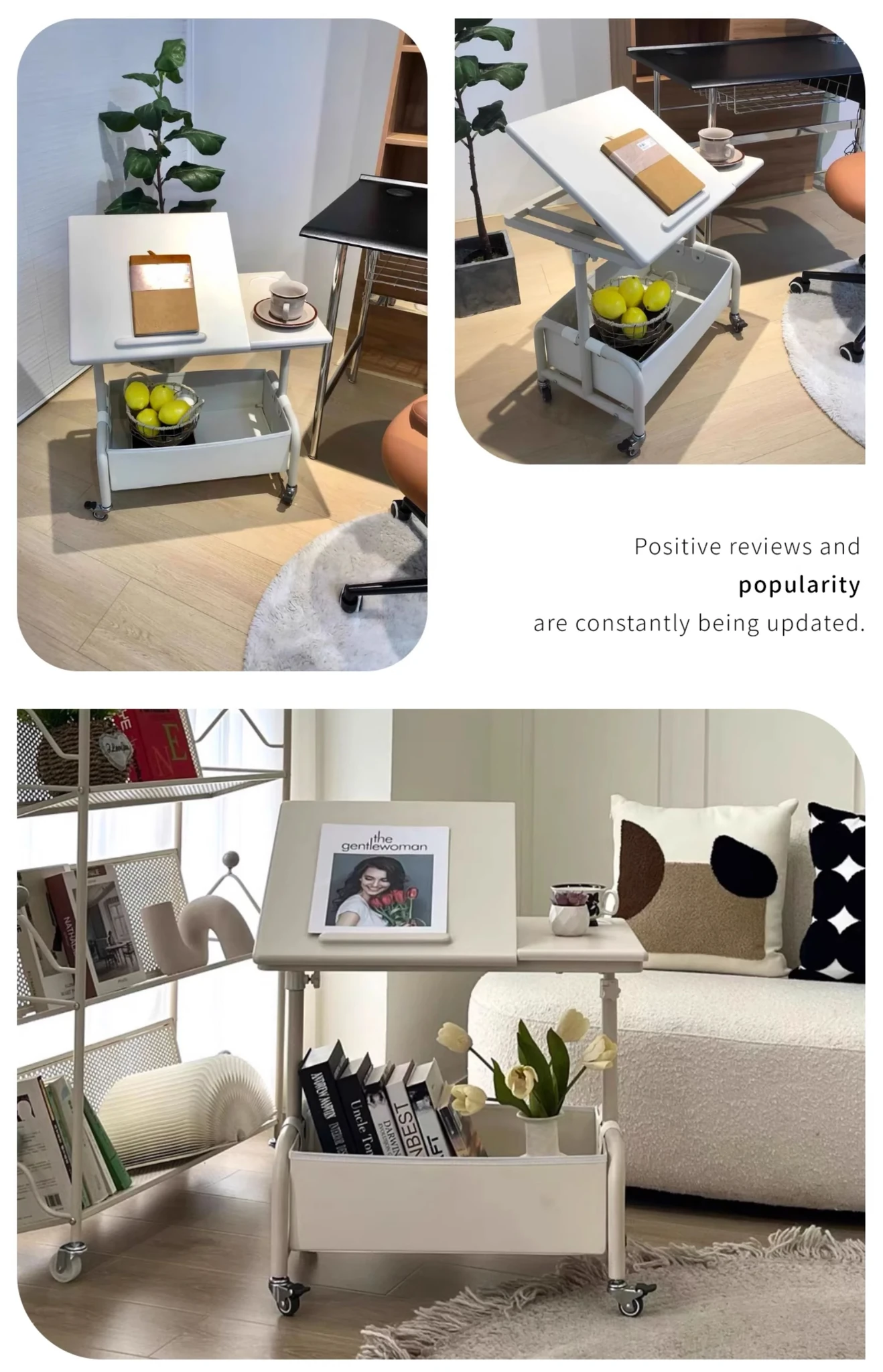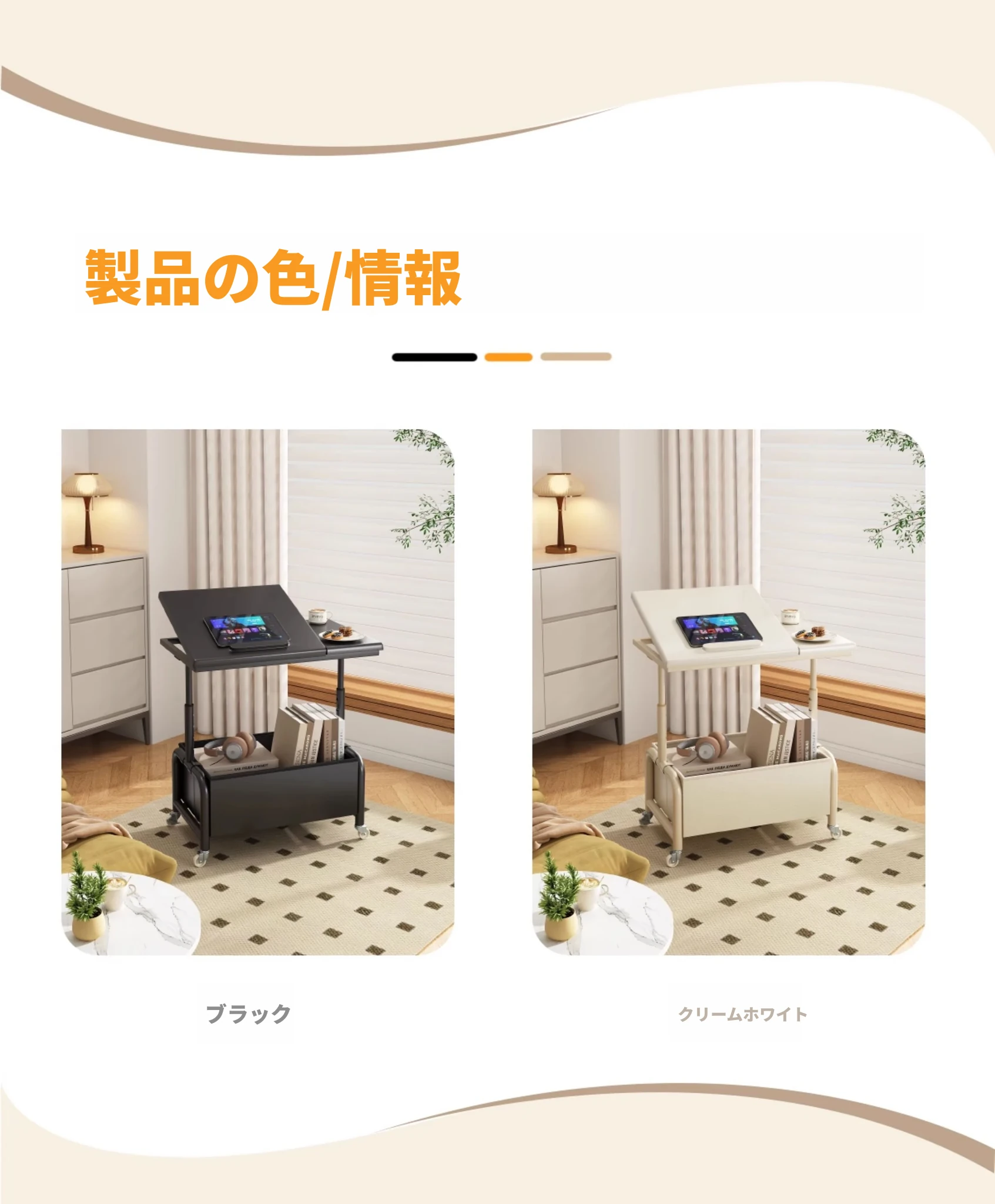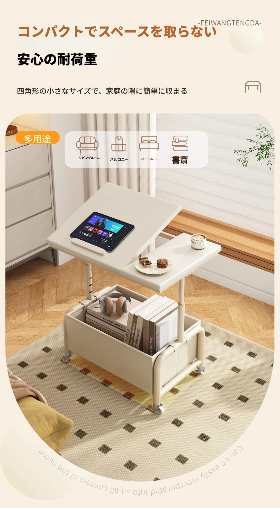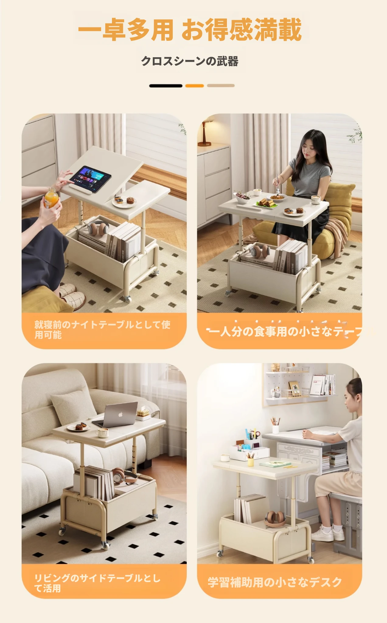 移動式昇降テーブル!おしゃれなクリーム風デザインの小型キャスター付きカート。バルコニーやベッドサイドに最適な収納ラックとしても使える、リビングのソファ横にぴったりのサイドテーブルです!