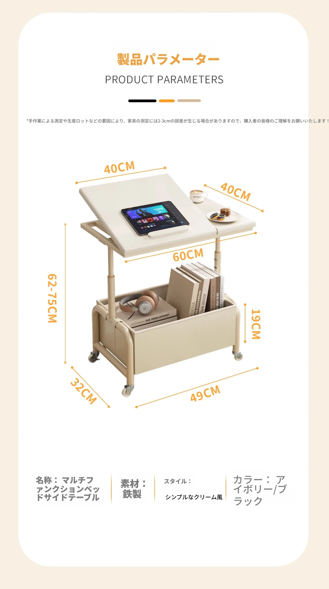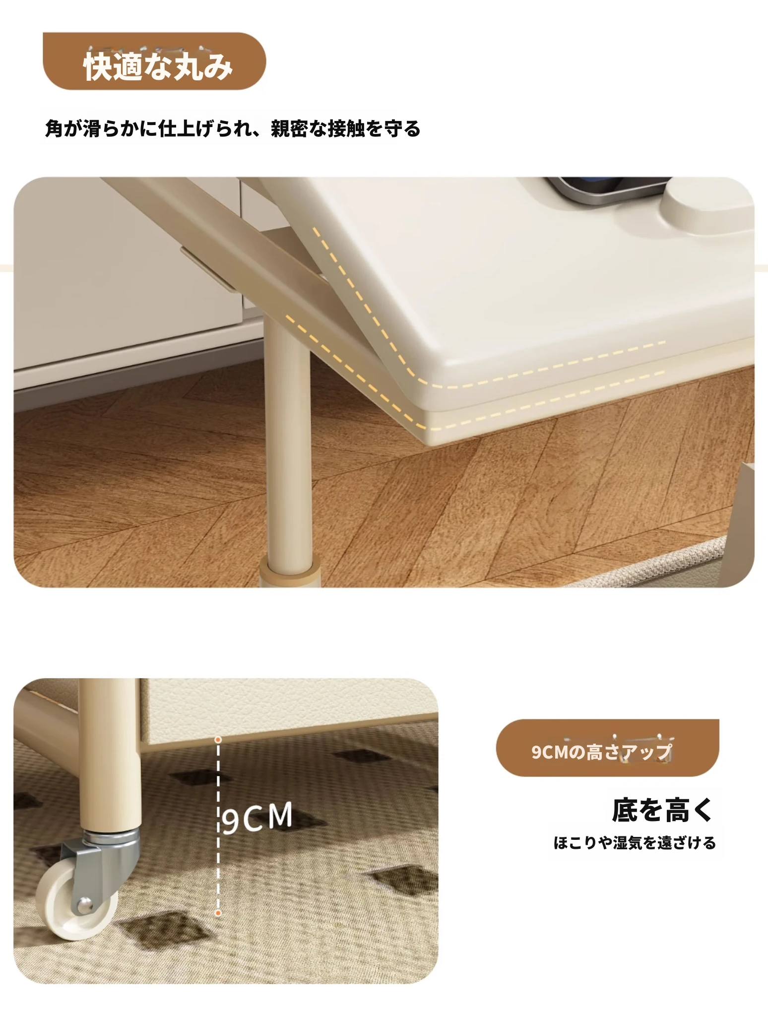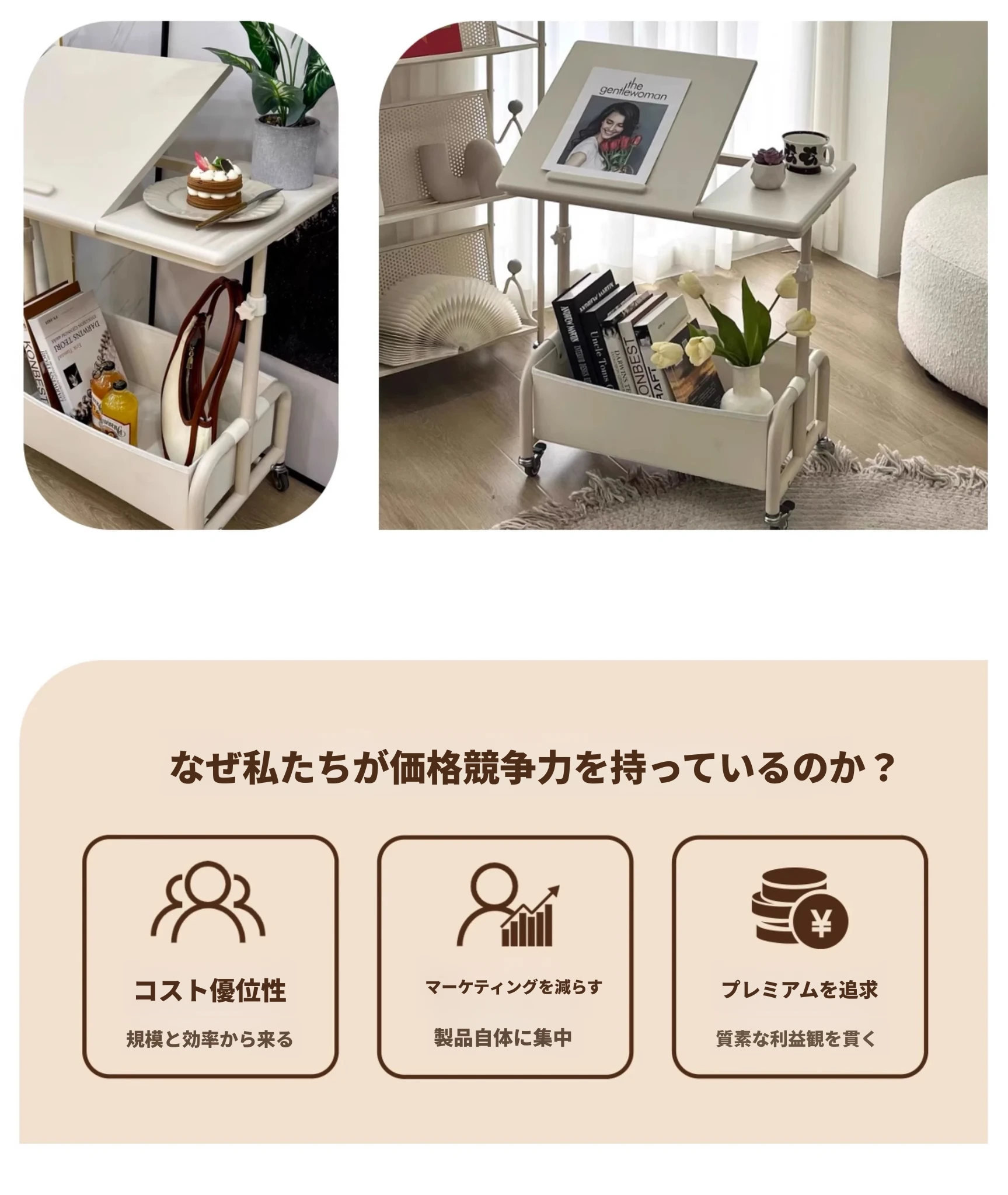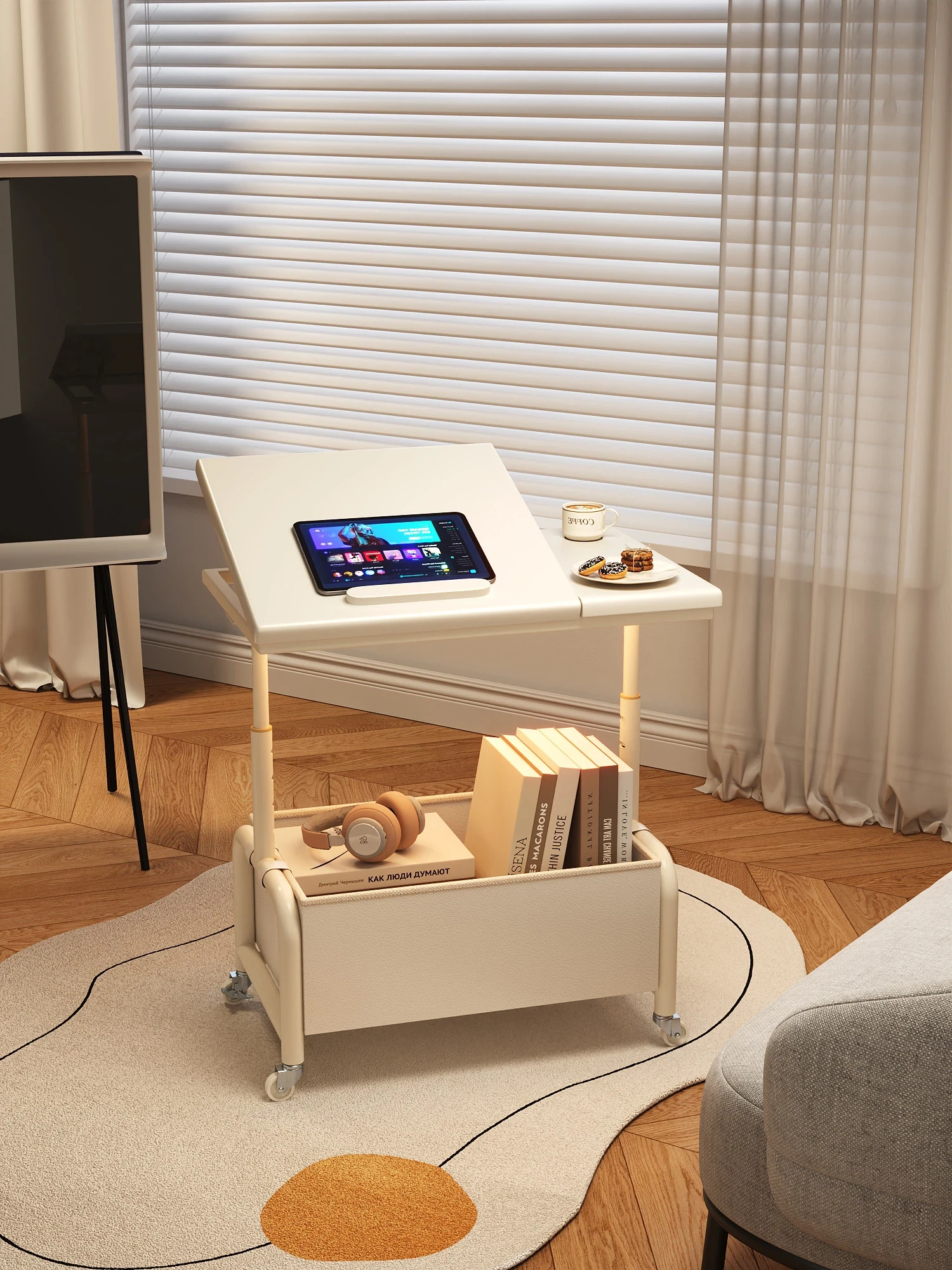 移動式昇降テーブル!おしゃれなクリーム風デザインの小型キャスター付きカート。バルコニーやベッドサイドに最適な収納ラックとしても使える、リビングのソファ横にぴったりのサイドテーブルです!