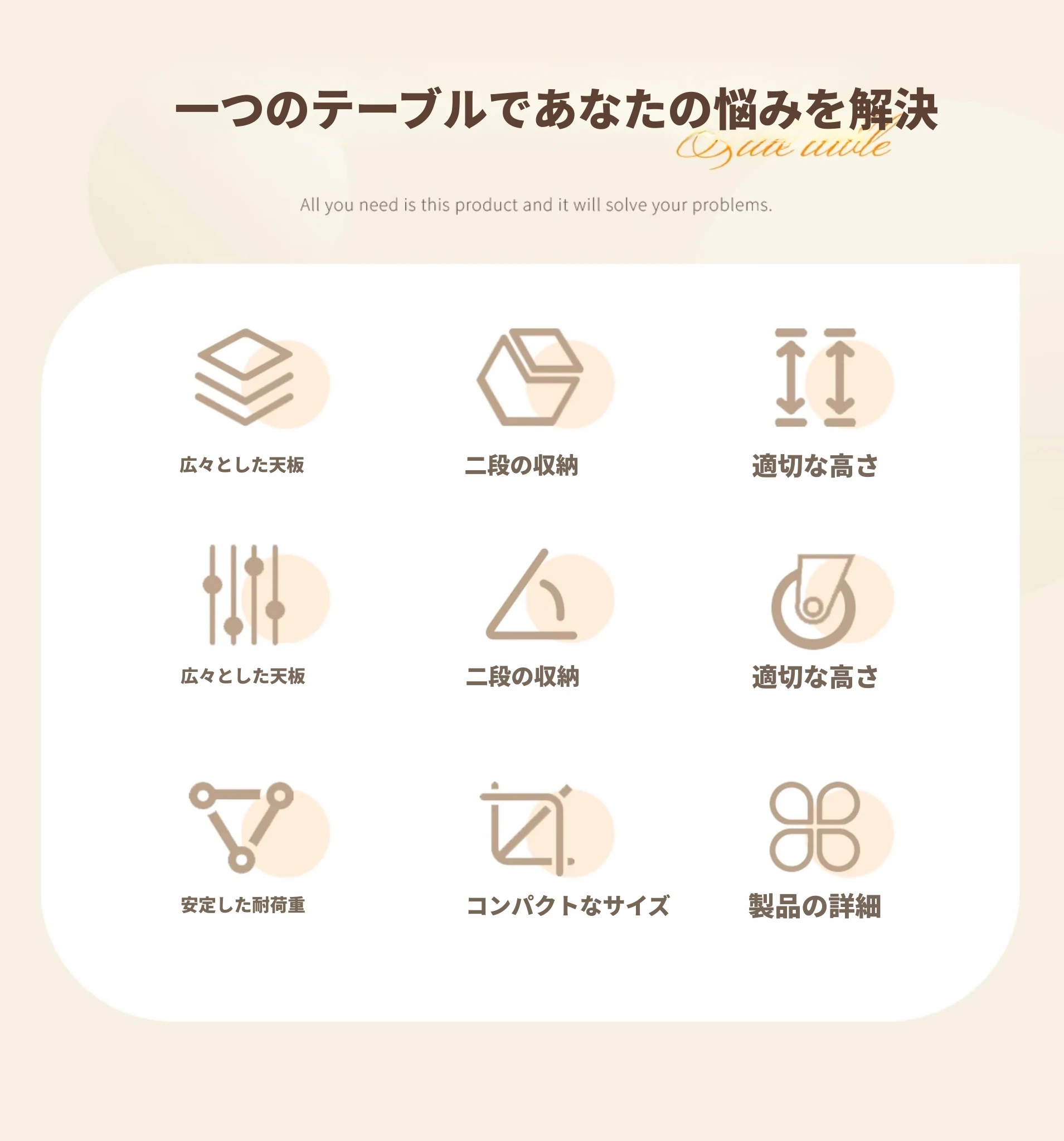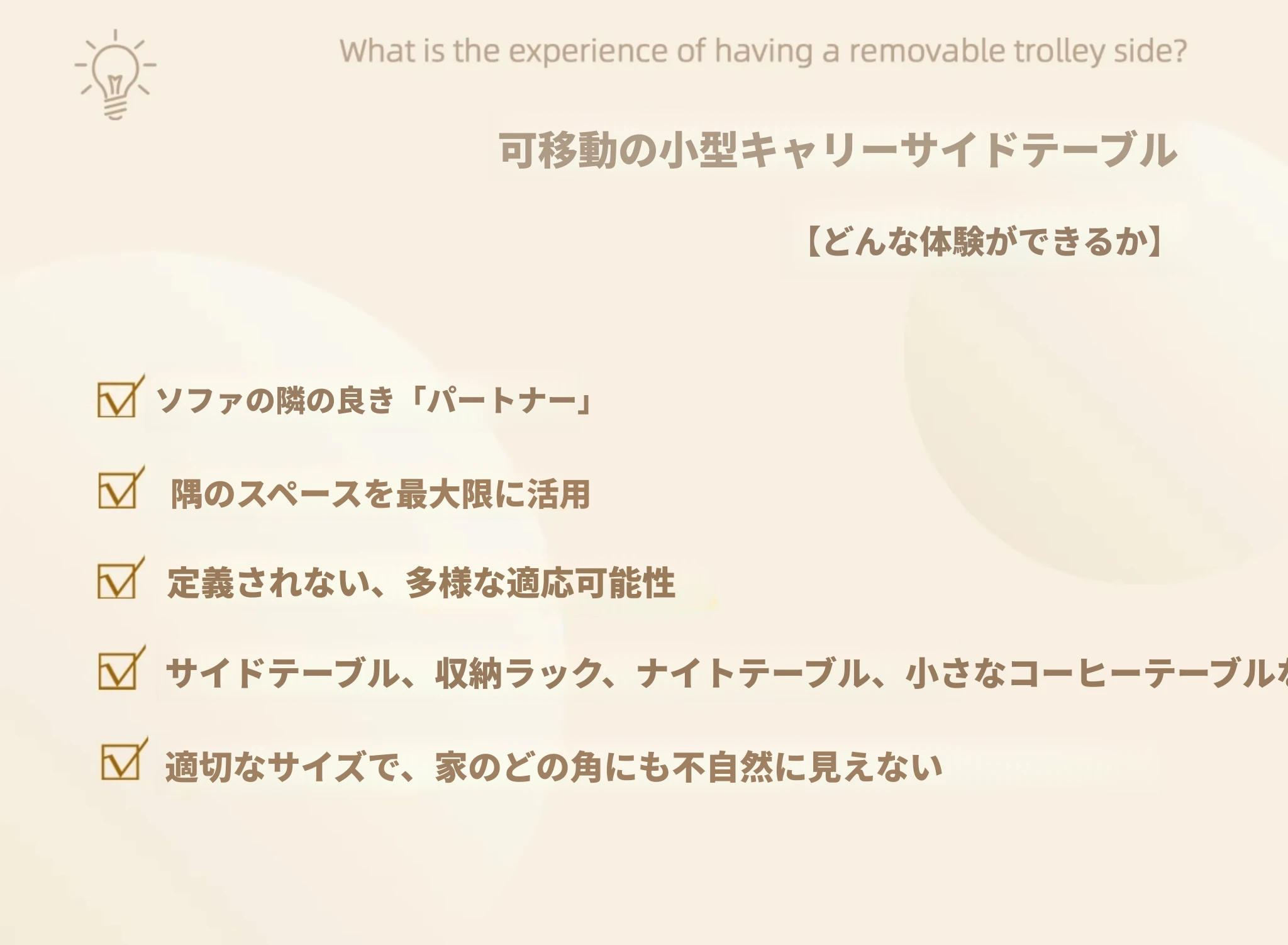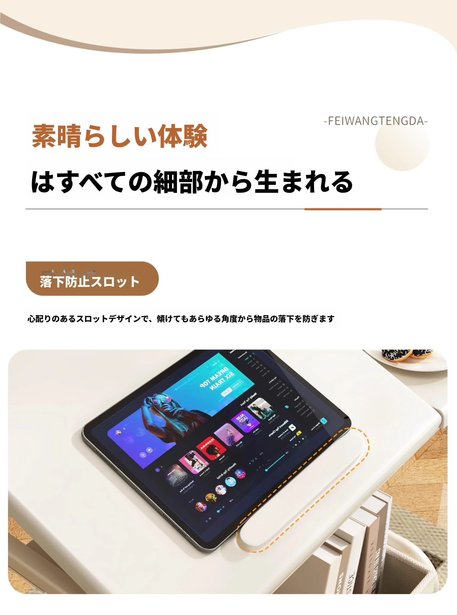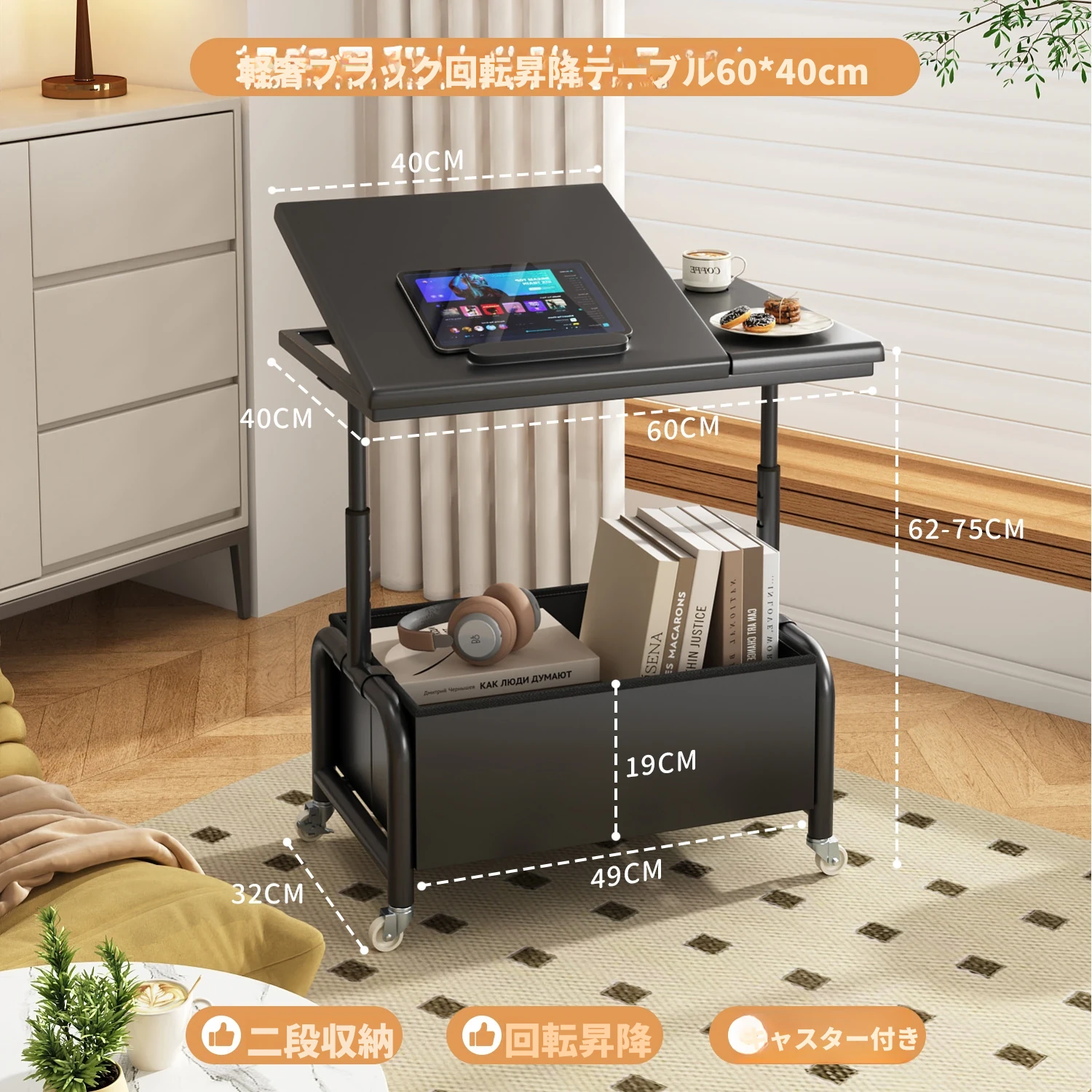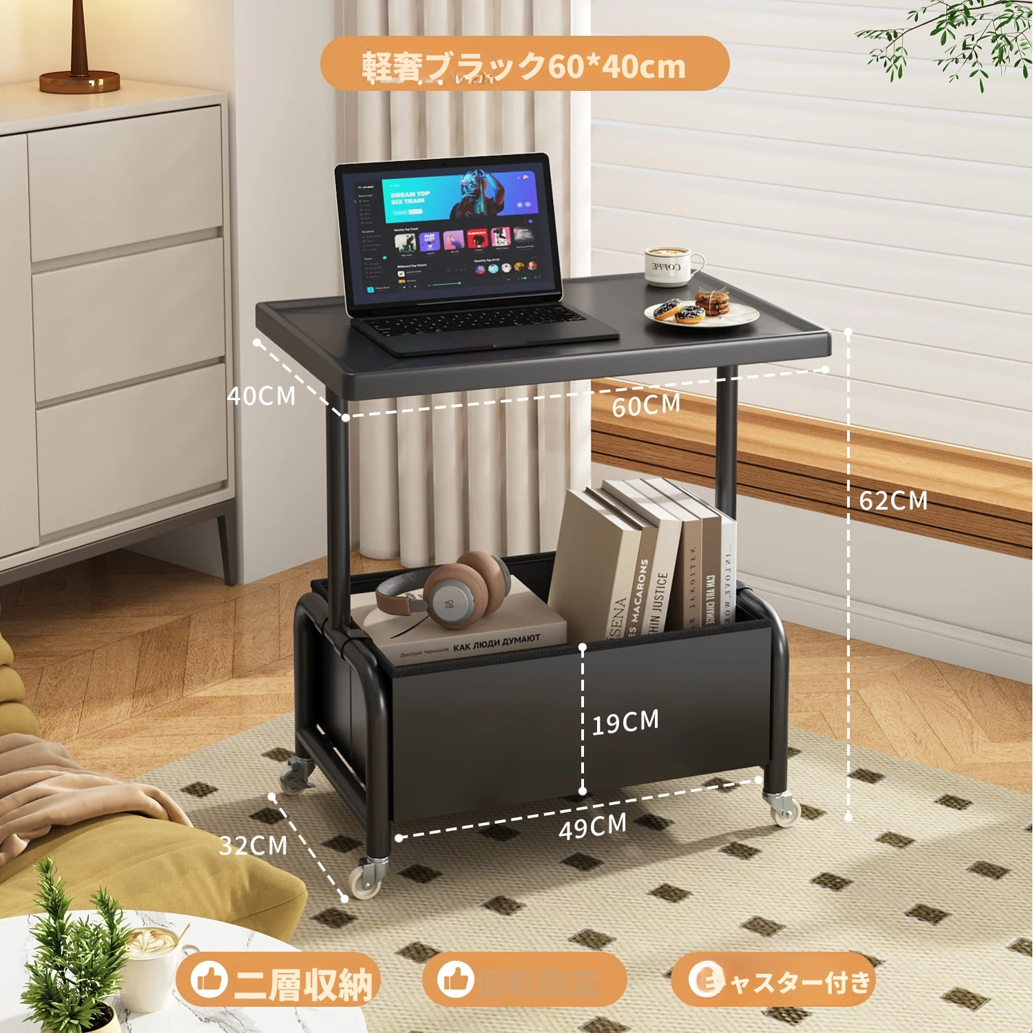 移動式昇降テーブル!おしゃれなクリーム風デザインの小型キャスター付きカート。バルコニーやベッドサイドに最適な収納ラックとしても使える、リビングのソファ横にぴったりのサイドテーブルです!