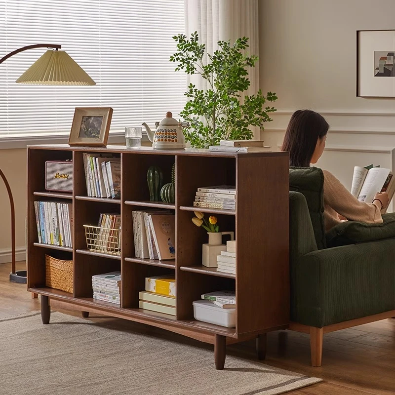 ウォールシェルフ一体型の無垢材書架 - おしゃれなリビングの間仕切り収納キャビネット、クルミ色の格子デザインでスタイリッシュに本や小物を整理!
